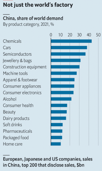 其中,英国《经济学人》发表题为《跨国公司发现很难放弃中国市场》的文章称:“中国日益富裕的14亿居民购买了全球四分之一的服装、近三分之一的珠宝和手提包、五分之二的汽车,以及相当大比例的包装食品、美妆产品、药品和电子产品等。同时,拥有庞大制造业的中国还是世界最大的机床和化学产品市场,也是建筑设备的最大买家。”