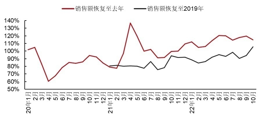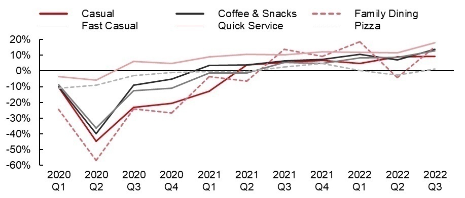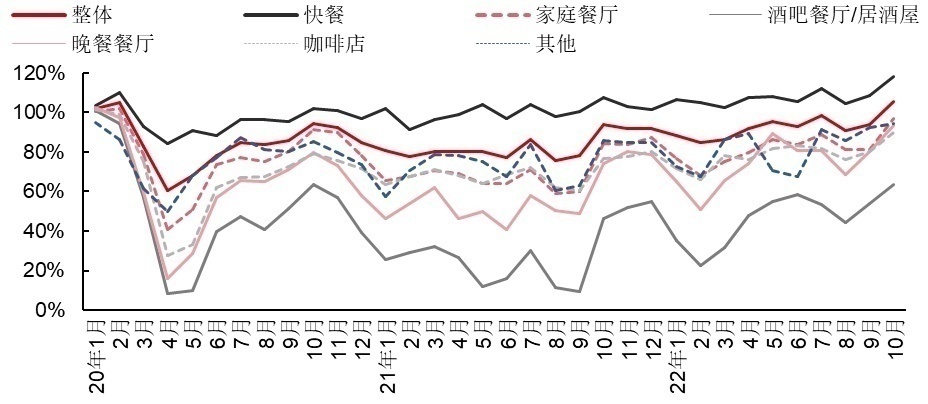 而家庭餐厅、咖啡店等其他业态,受限于消费场景,外卖需求较弱,复苏的进程比快餐缓慢。但到2022年10月份,这些业态也普遍恢复到疫情前90%的水平。