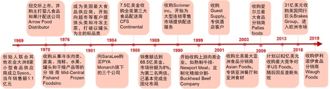 1969年,九家食品配送商合并成立了Sysco。第二年,Sysco就实现了上市。此后, Sysco通过多次并购实现了多品种跨区域的运营。
