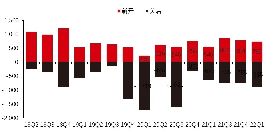 从门店的开关数量来看,2020年一季度餐厅开店数量骤减,关店数量较多。此后,餐饮行业的开店数量呈现增长态势。到2021年的三季度,餐饮业新开店数量达到了85万家,这也是最多的一个季度,之后又逐季缓步下滑,同时,我们注意到,餐饮关店的数量也有所增长。