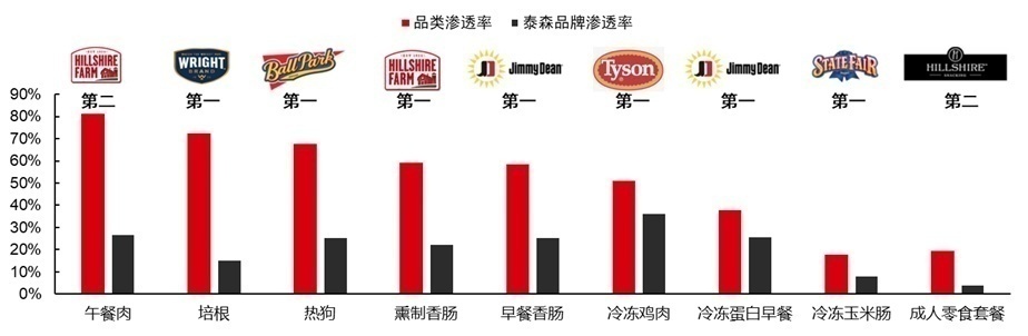 目前,泰森食品不仅是上游鸡肉、牛肉、生猪等原料领域的龙头企业,同时也在下游领域排名靠前,如午餐肉,培根、香肠等多个领域。