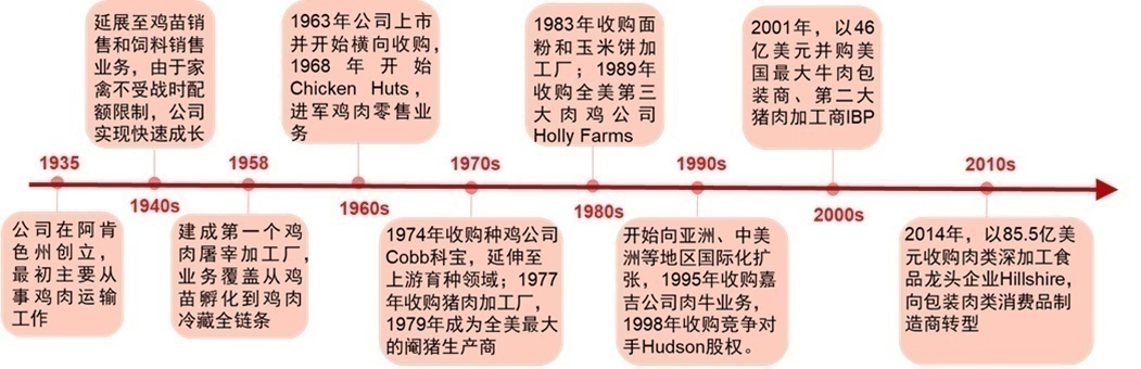 泰森食品成立于上世纪30年代。1990年前,泰森食品在运营的六十多年里,主要在鸡肉行业进行垂直整合,并实现了从育种、饲料到屠宰加工的全产业链闭环。