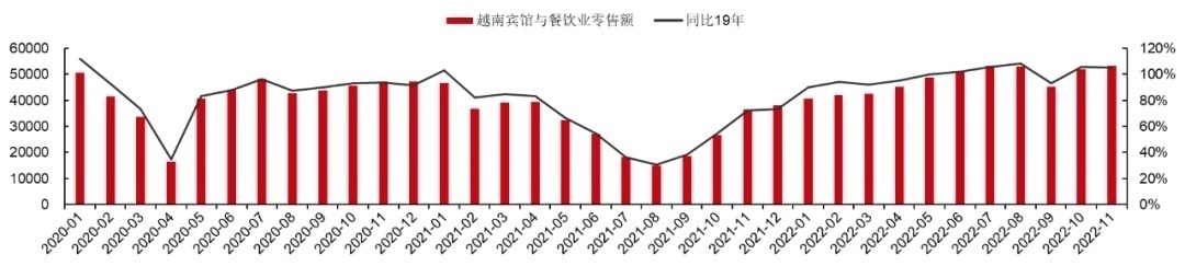 2021年10月,越南逐渐放松时,餐饮业同样出现了复苏。2022年5月,越南完全放开时,其餐饮的零售额也恢复至疫情前的水平。