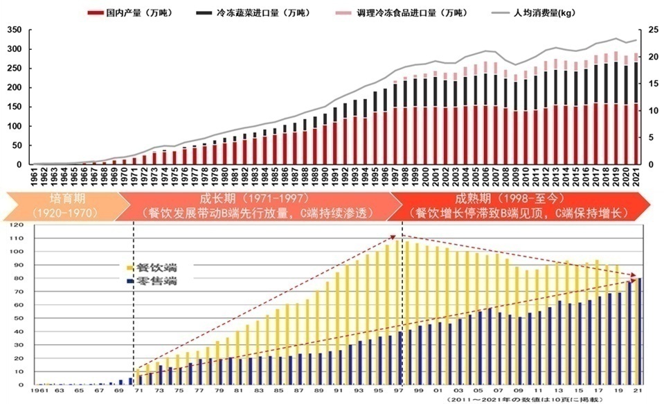 整个行业的发展分为三阶段。早期,日本通过奥运会、世博会等活动,引导消费者初步接受了冷冻食材,完成了消费者教育,冷链物流等基础设施也同步铺设完善。70年代后,日本餐饮行业快速增长,连锁化率提升,促使B端的冷冻食材先行放量,后面C端也进行持续渗透。