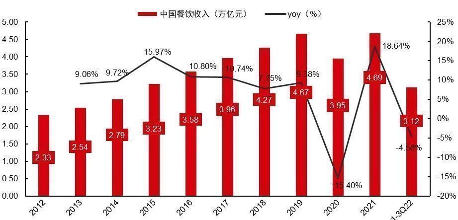 回归到中国,2020年,中国餐饮总营收跌破4万亿, 2021年恢复到了2019年疫情前的水平,达到了4.69万亿。2022年前三季度,国内餐饮同比下降4.6%,达到3.1万亿。