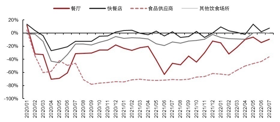 △美国食品服务及餐饮业零售额及同比2019年同期增速(十亿美元);资料来源:美国人口普查局,Bloomberg,中信证券研究部