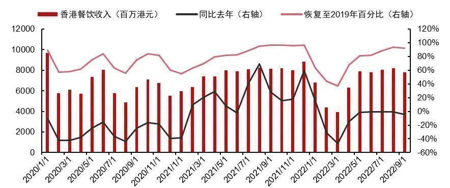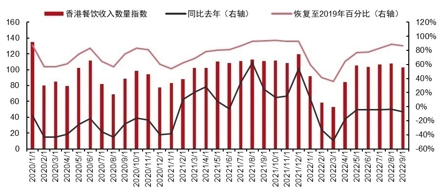 到2022年9月,香港的餐饮收入已经恢复到了2019年的92%,香港餐厅的数量也恢复到2019年的87%。