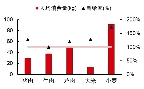 △美国主要食物人均消费量及自给率-2021;数据来源:USDA,美国经济分析局、泰森食品官网,中信证券研究部