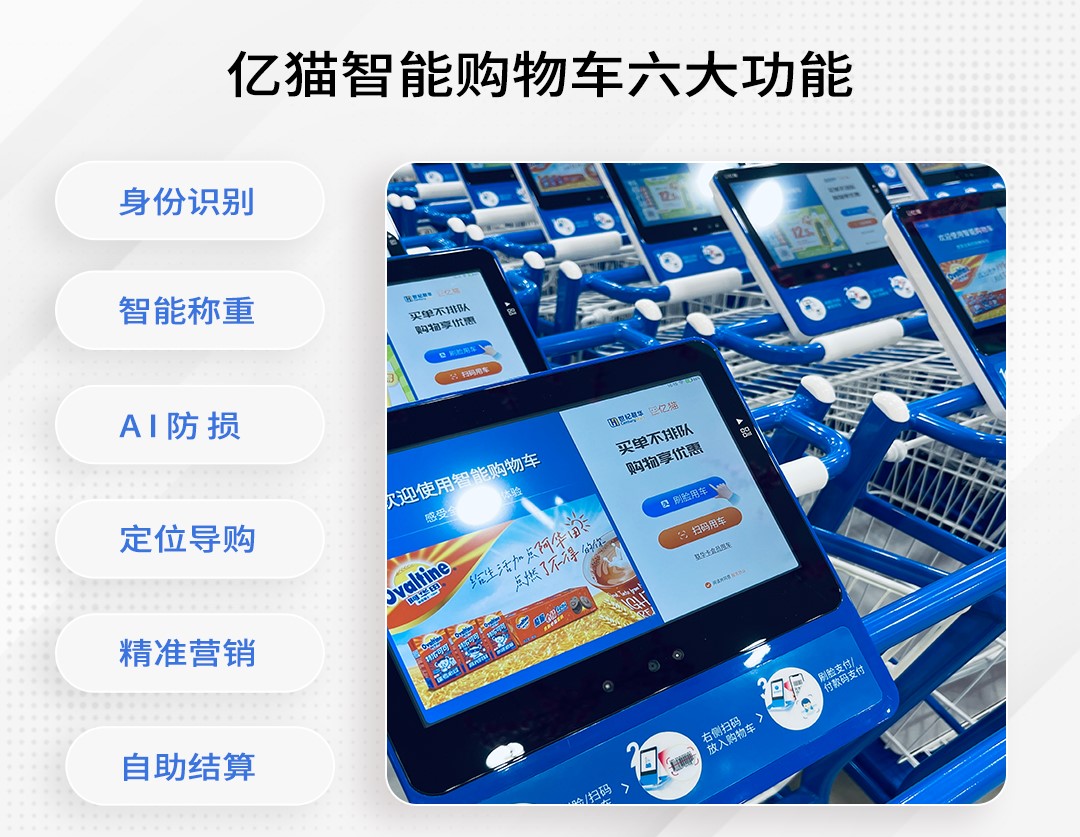 亿猫智能购物车能够通过分析客户特征、购物、路线等流程数据,实现身份识别、智能称重、AI防损、定位导购、精准营销、自助结算六大功能,以顾客为中心、以数据为驱动,经过后台数据对接处理,描绘精准的顾客画像,构建多种营销模型,重构“人、货、场”关系,打造新一代的沉浸式购物场景。