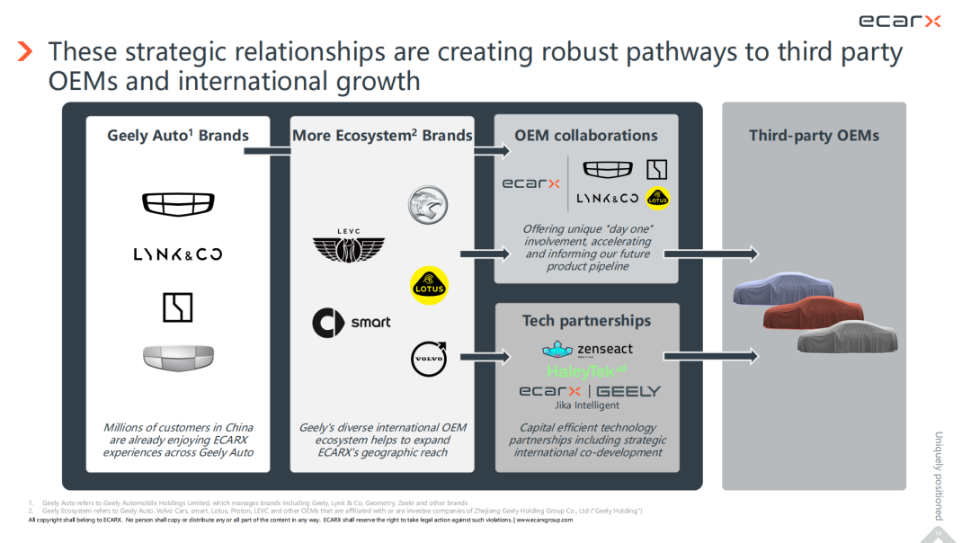 但目前从客户构成来看,亿咖通客户主要还是李书福关联公司,一类是吉利控股旗下品牌,包括吉利、沃尔沃、路特斯、宝腾、极氪;另一类是吉利入股企业,包括奔驰、smart等。