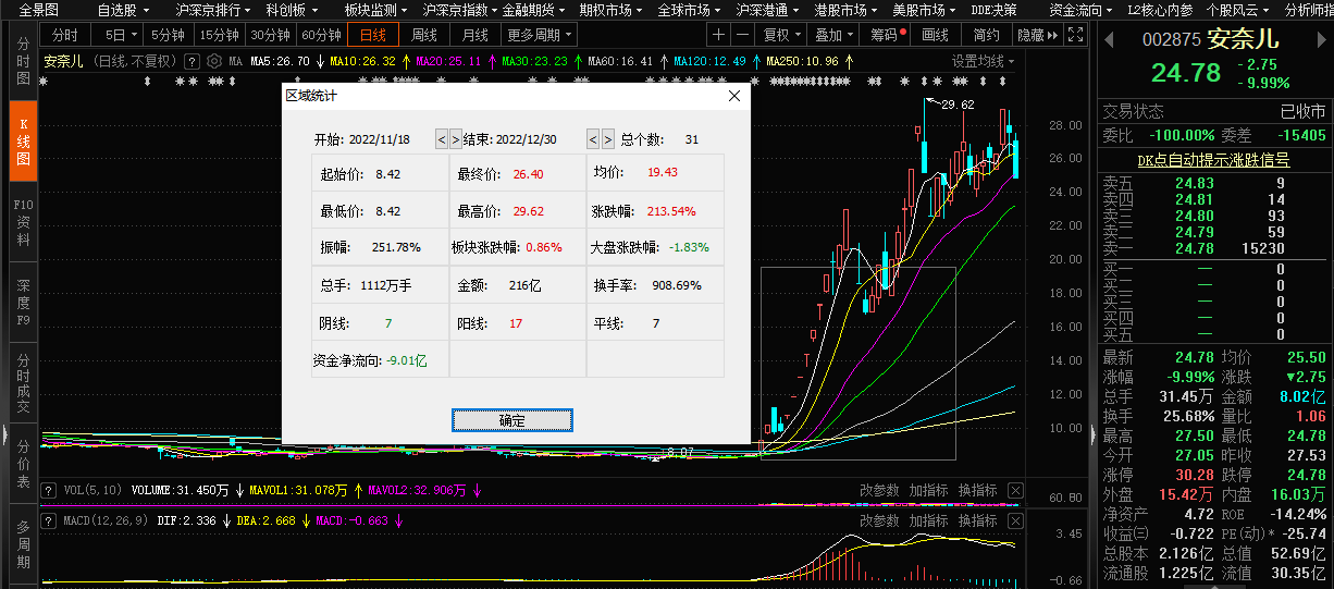 自从该公司不断传出布局抗病毒抗菌面料的消息,其股价行情便异军突起。交易行情显示,在2022年11月18日至12月30日期间,走出16个涨停板的行情,31个交易日内股价累计涨幅翻了2倍之多。2022年12月23日,安奈儿盘中股价曾一度创下29.62元/股的年内新高。