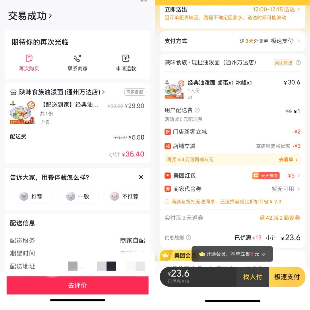 以「自象限」在抖音上下单为例,同一商家的同一套餐价格相同,配送费也均为5元左右,但美团有各类补贴:配送费减5元、新客红包立减2元、天天神券立减3元,杂七杂八算下来,比抖音便宜12元左右。