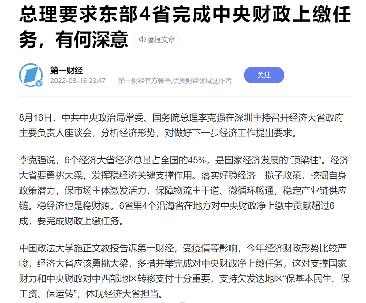 来自第一财经的报道,东部四省(广东、江苏、浙江、山东)今年必须完成财政上缴任务,但一份上半年全国各省财政收支情况统计表显示,全国所有省市财政收支都为负。也就是说,东部地区勒紧裤腰带也得支持内陆地区,先富带后富。