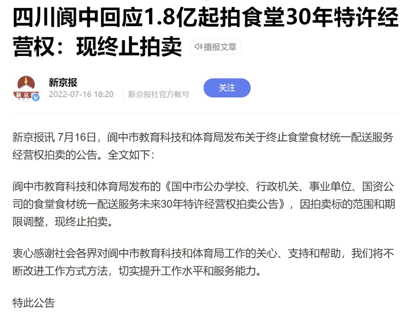 上个月,四川南充阆中市1.8亿甚至拍卖30年食堂经营许可证。拍卖标的物为,阆中市公办学校、行政机关、事业单位、国资公司的食堂食材统一配送服务未来30年特许经营权。起拍价1.8亿元,竞买保证金2万元,涉及公办学校98所,行政机关、事业单位、国资公司77个单位。不过,后续拍卖终止。