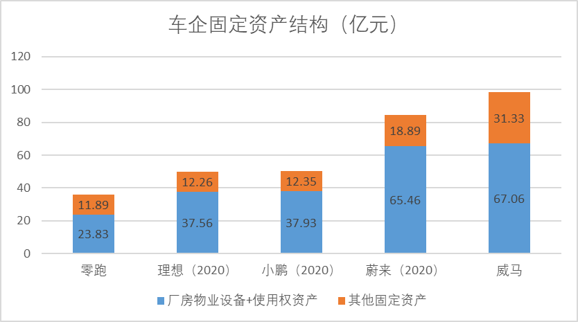 将新势力车企按销量数据调整到差不多的节点(蔚来、理想、小鹏采用2020年年报数据)横向对比,发现了一个很有意思的地方:零跑是其中资产最“轻”的,其固定资产仅35.72亿,不到蔚来的一半,差不多是威马的三分之一。