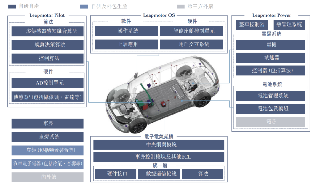 招股书现实,零跑的电芯和内外饰是外购,其它的算法、软硬件、电子电气架构等都是自研,绝大部分是自研自产。