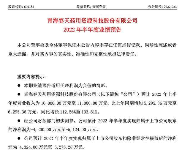 7月14日晚间,青海春天同时发布绩预告称,预计2022年上半年实现净利润-4200万元至-5124万元。而2021年同期营业收入为4704.64万元,归属于上市公司股东的净利润为亏损4971.26万元。