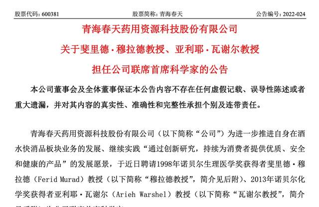 7月14日晚间,青海春天对外公告,聘请1998年诺贝尔生理医学奖获得者穆拉德、2013年诺贝尔化学奖获得者瓦谢尔与青海春天董事长张雪峰一同出任公司联席首席科学家,开展人体健康和酒的深入研究,期限三年。
