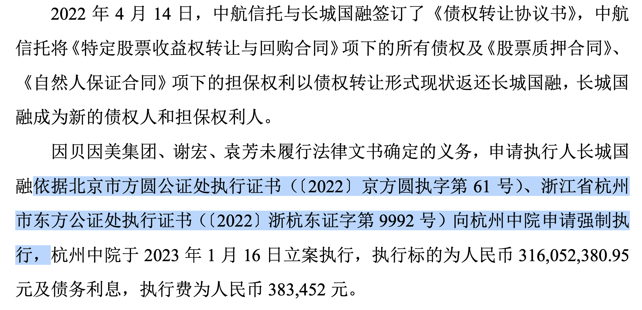 据贝因美《关于公司控股股东和实际控制人收到法院执行通知书的公告》,这起3.16亿标的的执行案件中,申请执行人并非依据生效判决提起强制执行申请,而是依据两份公证文书——北京市方圆公证处执行证书(〔2022〕京方圆执字第 61 号)、杭州市东方公证处执行证书(〔2022〕浙杭东证字第 9992 号)——直接向杭州中院申请强制执行。