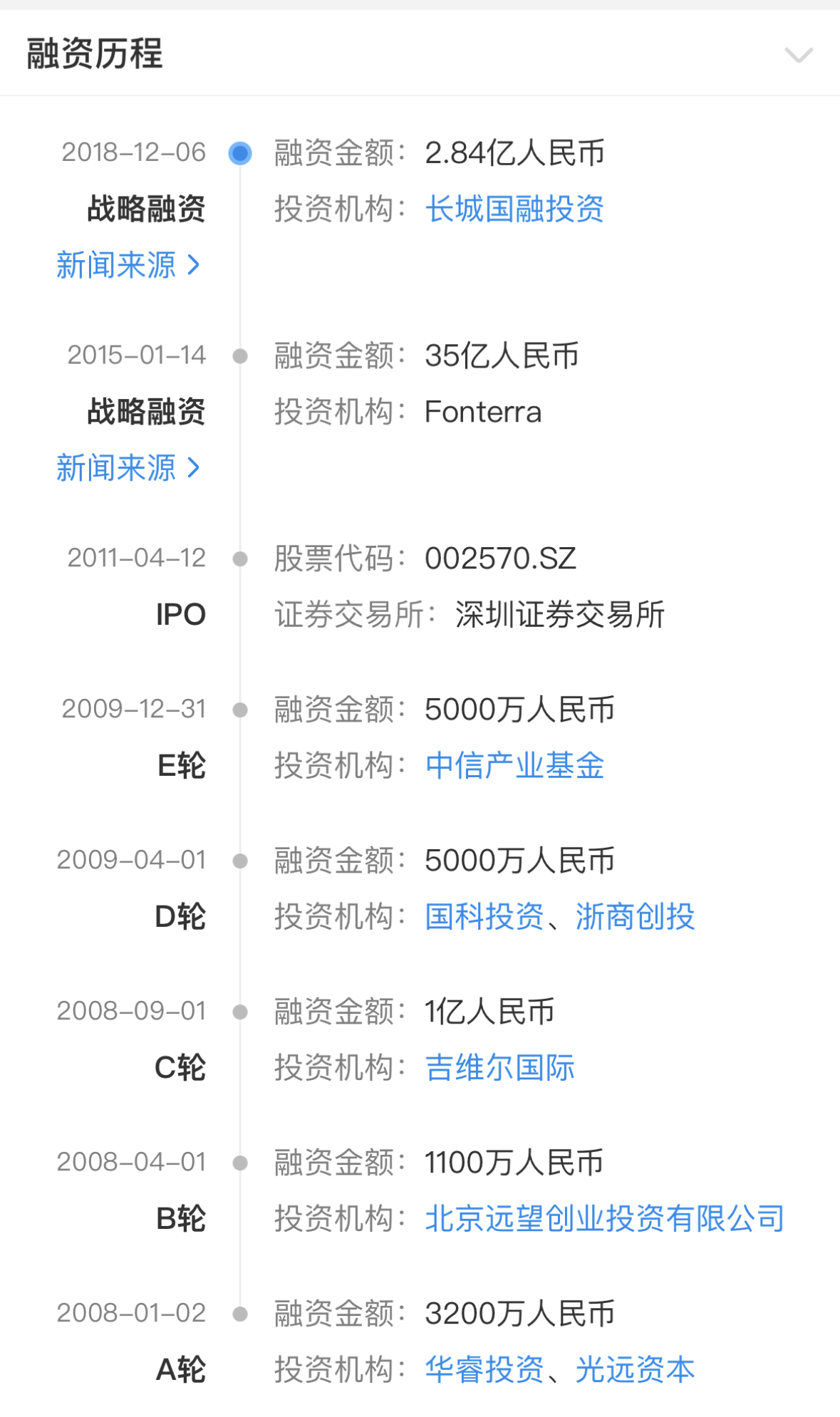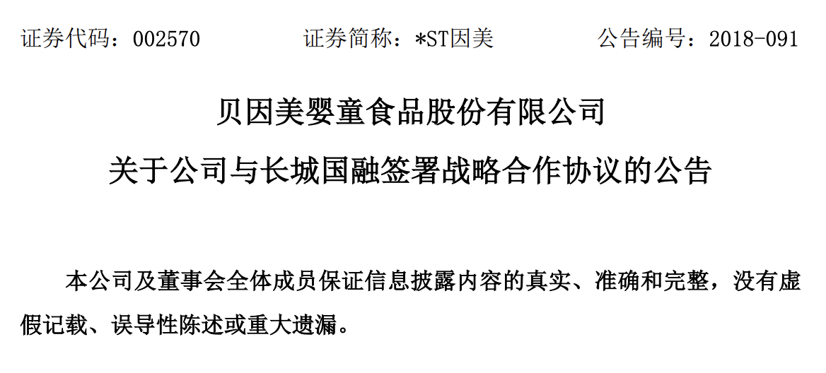 长城国融是贝因美股份2018年末宣布引入的新战略投资方。据相关公告,2018年11月29日,贝因美股份与长城国融签订了《战略合作协议》,约定“充分发挥长城国融优化企业债务结构的专业优势,为本公司及其下属企业提供包括资产重组、资产置换、产业投资、 股权投资等在内的综合金融服务方案。”