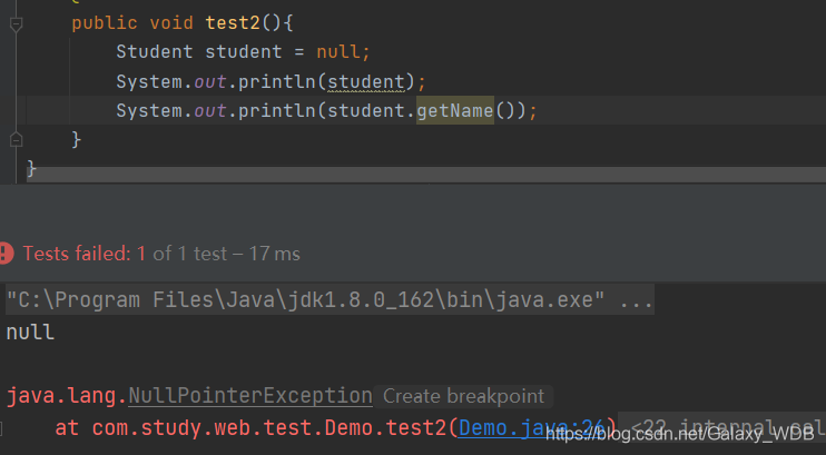 第二条输入出语句 "null.属性" 或者 "null.方法 " 的时候,即当一个对象不存在时又调用其方法或者是属性,就会产生异常。