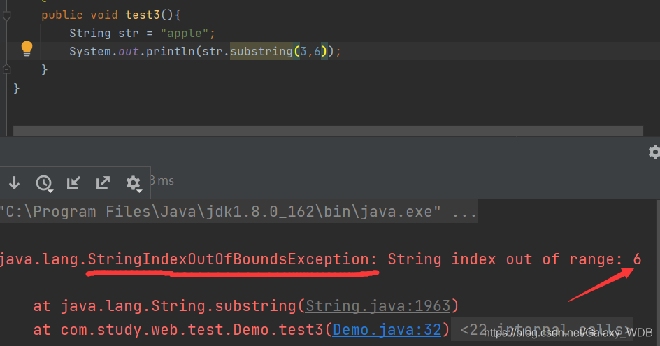 运用字符串的截取--substring方法举一个简单例子。截取下标3到6的,取不到6,就是下标到5。然后发生了字符串下标越界异常。因为超出了这个字符串的范围。