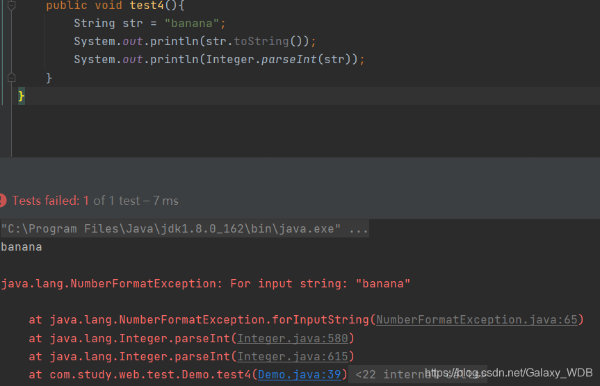 新建一个字符串banana。例子中第二条输出语句报错,即数字格式化异常。第二条输出语句是将str以int类型输出,而创建的是字符串,就会发生数字格式化异常。