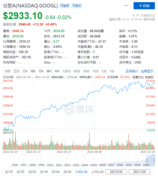 谷歌,2021年收获最大的巨头之一。截至发稿,其母公司Alphabet股价年内涨幅高达67.35%,这是万亿巨头中最高水平的增长,并且是2009年以来表现最好的年份,堪称“大象起舞”。其当前市值约1.95万亿美元,曾在11月短暂超越2万亿美元,成为苹果和微软后第三家市值超2万亿美元的公司。