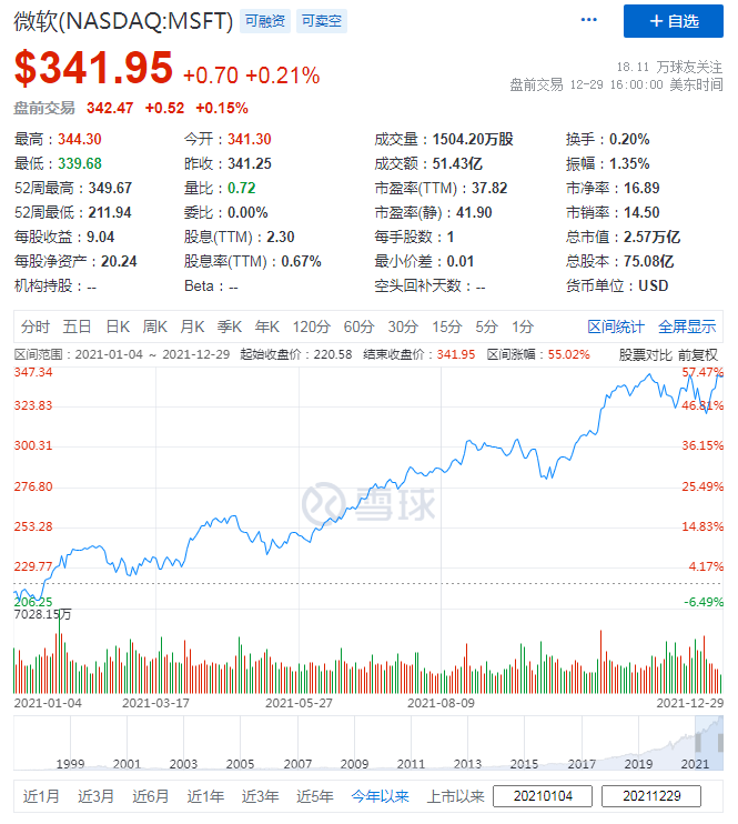 长期跟踪巨头的Wedbush分析师Dan Ives认为,明年至少有两家市值突破3万亿美元的公司。一家是苹果,另一家就是微软。而微软今年才突破2万亿美元市值大关。年初至今,微软股价总计涨幅达55.02%,并且近乎是一路上行。