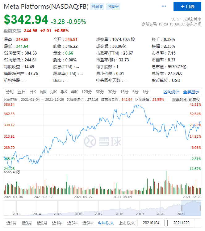 和亚马逊类似的,Meta在经历了半年的持续上涨后,自9月起陷入反垄断、苹果隐私新政、信息安全问题等一系列“水逆”之中。扎克伯格甚至被诸多外媒和用户称为2021年“最大恶人”。Meta今年最高涨幅原本超过40%,目前已回调到25.55%。