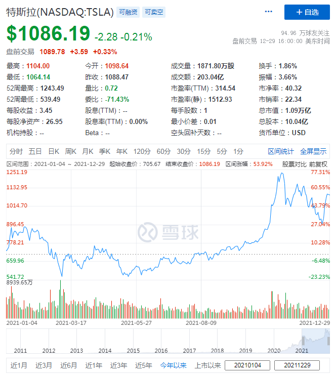 马斯克在2021年登上了74次微博热搜,相比之下,特斯拉在二级市场的热度也不落下风。在马斯克开启连续两个月的减持计划后,截至发稿,特斯拉今年依旧保持了53.92%的涨幅。