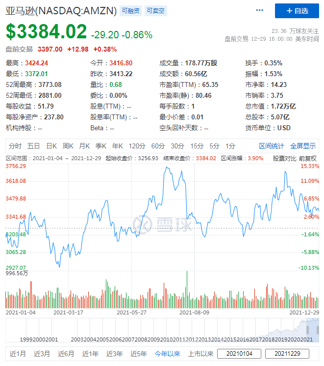 2021年不是亚马逊的光辉之年,AWS宕机、工人控诉亚马逊压榨、飞涨的国际物流成本和人工成本、为物流和网络进行的大规模投资、反垄断......在这些因素之下,今年以来,亚马逊股价仅仅增长了3.9%。