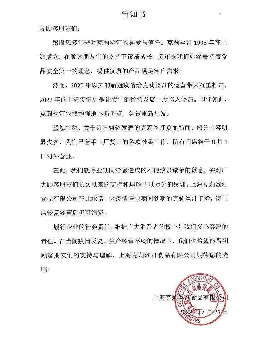 针对上述报道,上海克里斯汀食品有限公司对外发出通知,称媒体发表的部分内容明显失实,克里斯汀已在着手工厂复工的各项准备工作,所有门店将于8月1日对外营业。