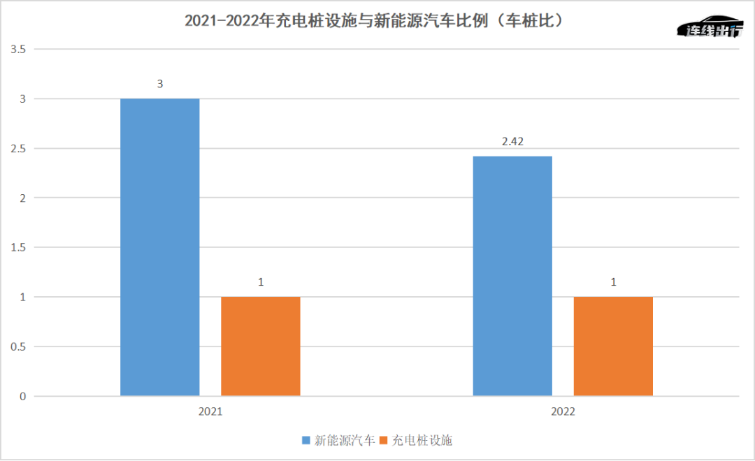 2021-2022年充电桩设施与新能源汽车比例(车桩比),数据来源于中国电动汽车充电基础设施促进联盟,连线出行制图
