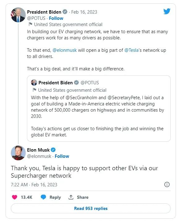 马斯克在推特上与拜登就开放充电网络交流,截图自推特