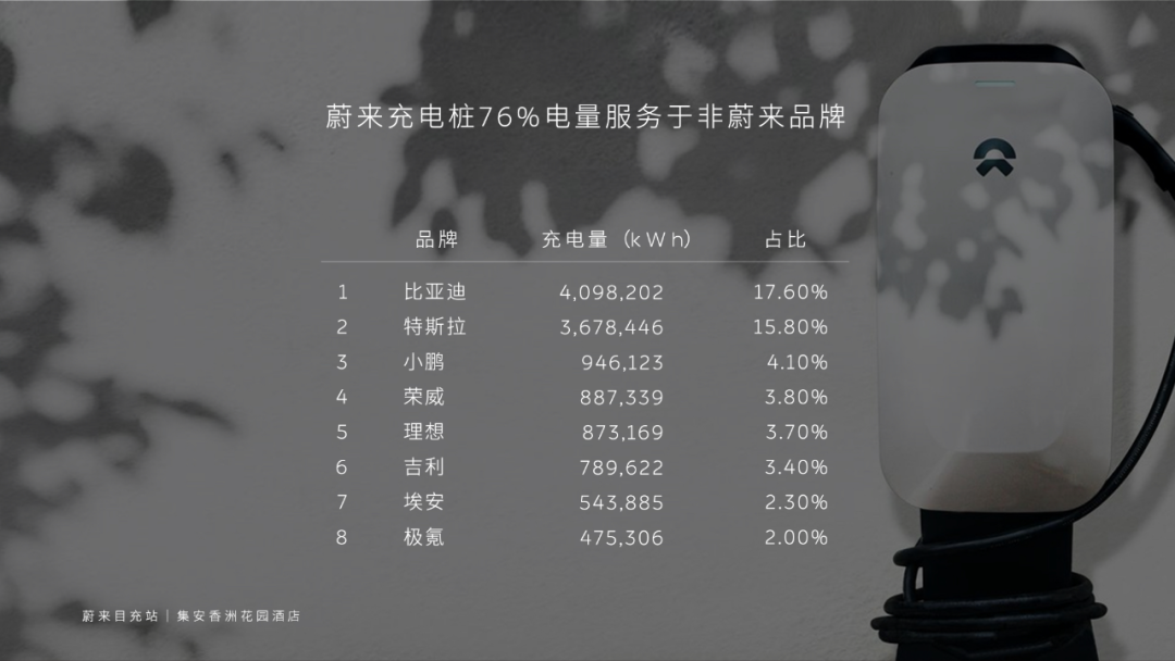 按照蔚来统计显示,在今年春节期间(1月13-2月5日),有将近76%的充电桩电量服务于比亚迪、特斯拉等第三方品牌的用户。