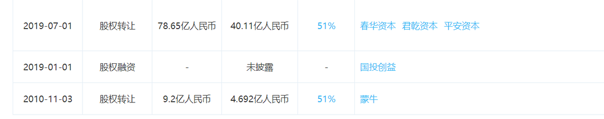 至于第二个跳板蒙牛,为君乐宝带来的则是品牌力的提升。据天眼查专业版APP显示,2010年,蒙牛以4.69亿元的价格收购君乐宝51%股权,成为君乐宝最大股东。2019年,蒙牛出售了君乐宝51%的股权,价格是40.11亿元人民币。