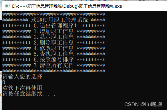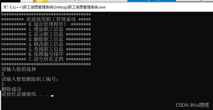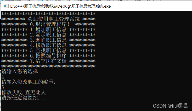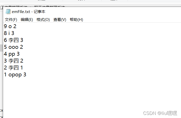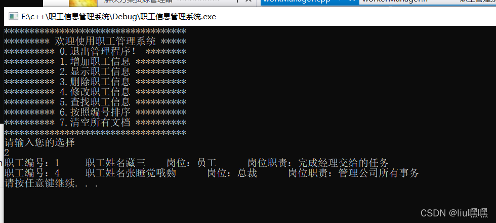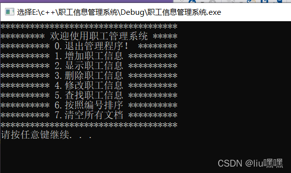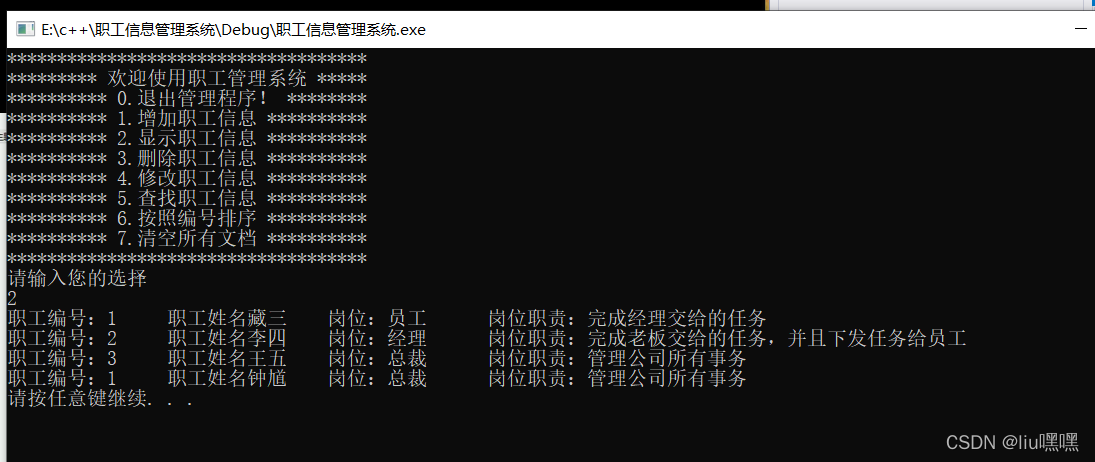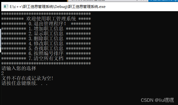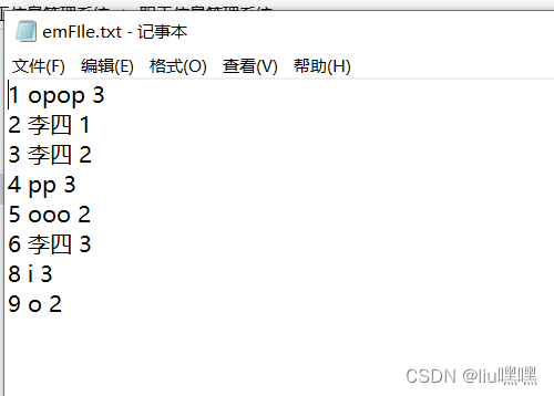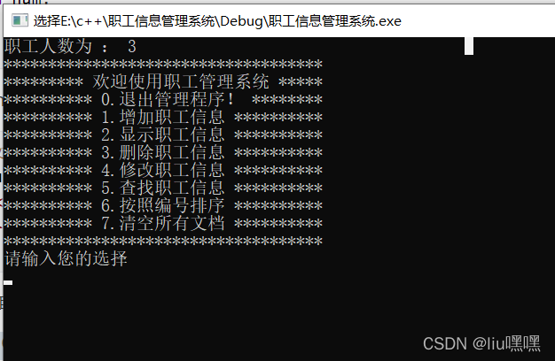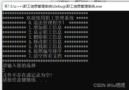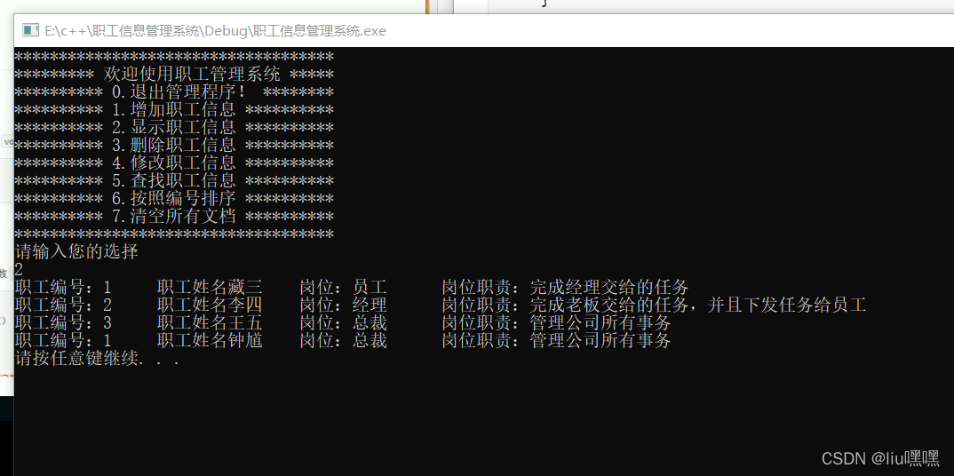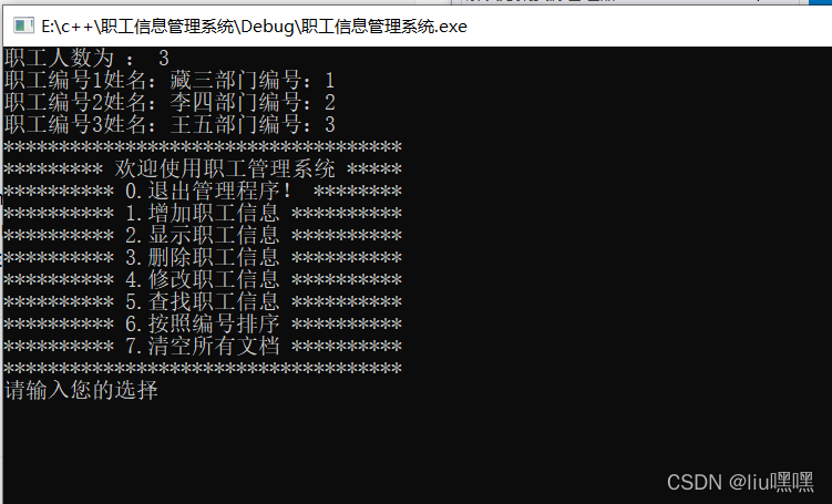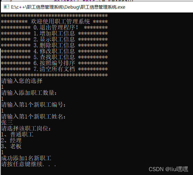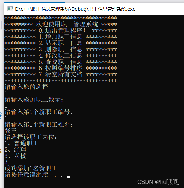 - 增加职工信息: 实现批量添加职工功能,将信息录入到文件中,职工信息为:职工编号、姓名、部门编号
