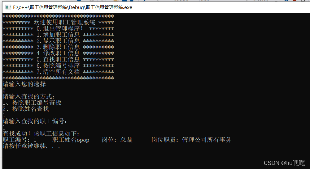 - 查找职工信息: 按照职工的编号或者职工的姓名进行查找相关的人员信息