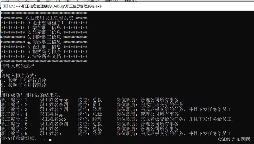 - 按照编号排序:按照职工编号、进行排序,排序规则由用户指定
