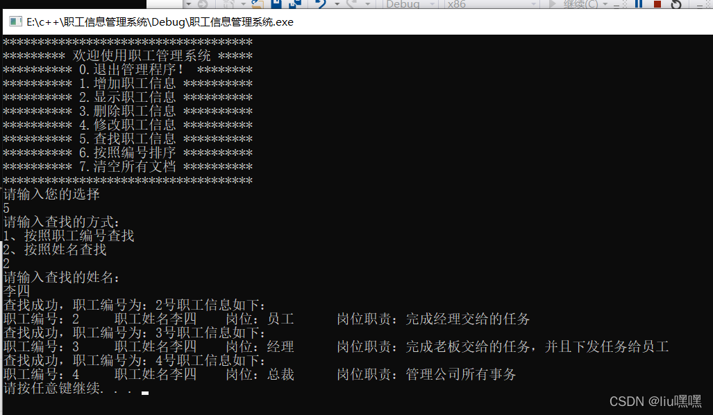 功能描述:提供两种查找职工方式,一种按照职工编号,一种按照职工姓名