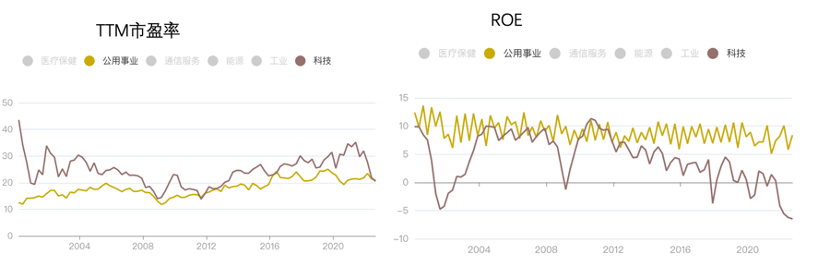 由于“定性”以及企业发展周期的不同,两类企业对投资者的回报逻辑是完全不同的,其中公用事业单位ROE由于行业经营成熟,几乎无成长性可言,ROE也就极为稳定,投资者对此类企业的投资赚取的往往是企业经营效益(通过股息分红形式回报投资者),相比之下科技企业ROE极为不稳定,近年来更是回到了负数区间,市场更看重行业的成长性,以此给予高溢价能力。