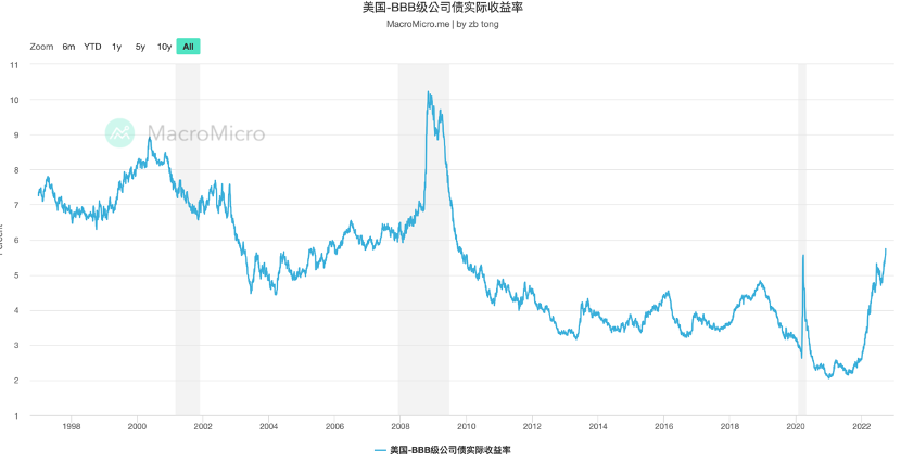 我们再看流动性的又一个指标,美国BBB级公司债实际收益率情况。我们知道此类债券几乎等同于垃圾债券,在流动性充裕之时,资金买入此债券获得高收益,一旦流动性回撤,此类债券风险最先暴露,资金率先撤离,甩卖债券导致收益率飙升(账面价值缩水),分析机构往往用此指标去判断市场的流动性偏好情况,见下图: