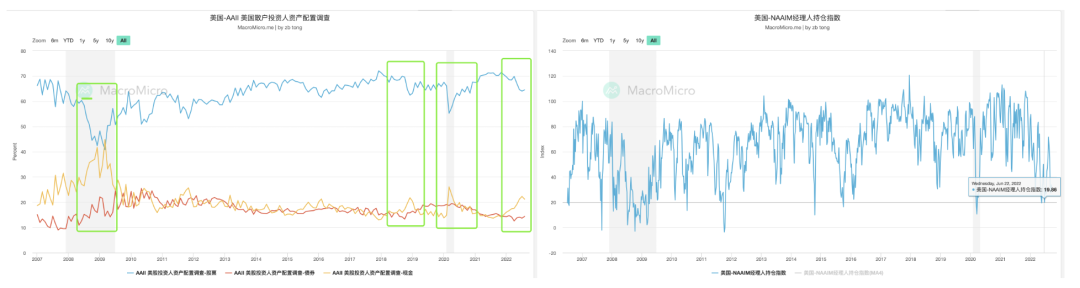 上图为我们整理的美国散户和机构的持仓情况。过去十余年内,股市和债市确实如前文所言有着密切的相关性,当前散户明显更偏爱现金,同期减持债市和股市,对冲性关系并未展示,不过在2018年的加息周期内则表现了一定对冲特性(同样偏爱现金,操作上更多减持股票而增持一部分债券)。