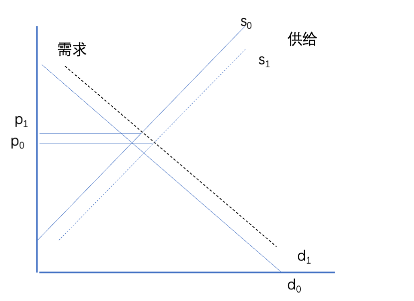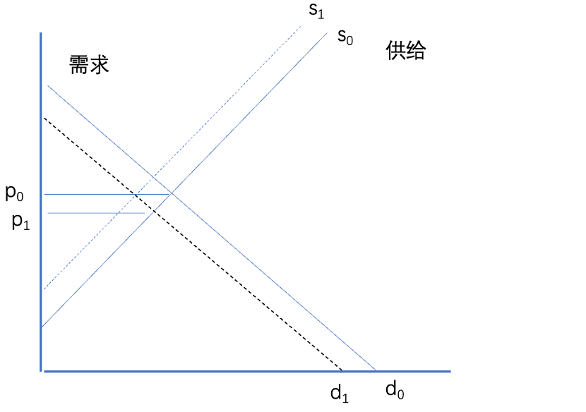 于是就会出现很奇怪的现象,为了确保总市场价格的平稳,一些企业会在此时降低供给,供给线左移(缺货,断供成为普遍现象),使价格重新回到p0,市场不断自我强化,走向收缩之路。