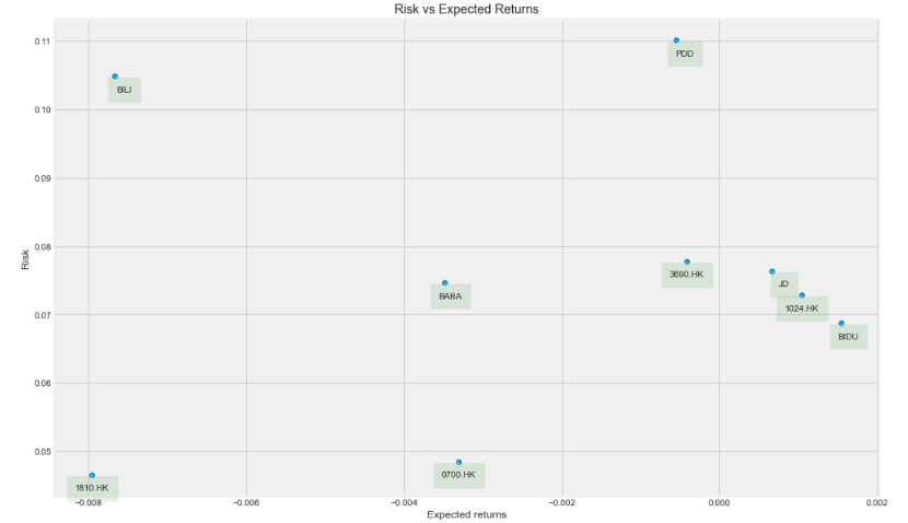 为客观对比不同企业在市场中的“定性”问题,我们首先采取量化分析手段,整理计算并建模,测算2022至今中概代表企业在资本市场中的表现:将股价每日变动标准差视为风险,平均每日变动则统计为期望收益,见下图: