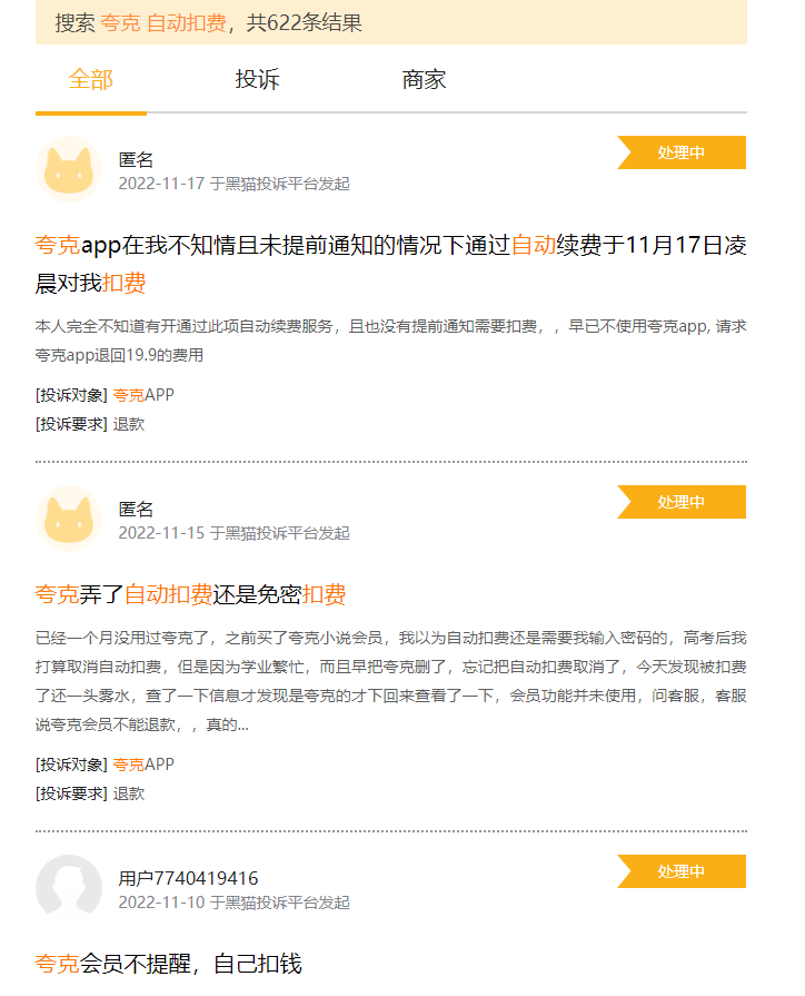 在黑猫投诉上,从11月底开始,就密集出现关于夸克乱收费的投诉,包括但不限于,没开会员却出现自动续费的扣款、不发任何相关信息及提示的情况下连续6个月自动扣款、宣传三天免费会员却直接扣款包月25元……