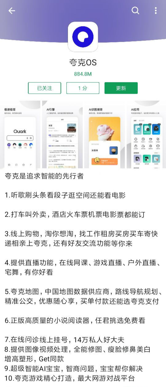 在酷安上,有网友p了一张未来夸克的图片:夸克浏览器变成了夸克OS,884.8MB,评分1分,功能应有尽有,听歌、看电影、叫外卖、购物、夸克地图、直播等等。