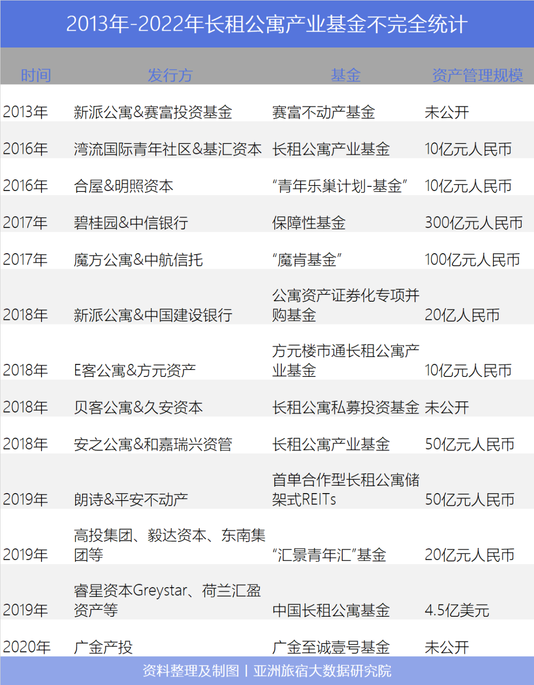 如果以新派公寓发行基金为起点,据亚洲旅宿大数据研究院不完全统计,自2013年以来,公布正式发行长租公寓产业基金(不包含投资平台)共有13笔,总计600亿元。
