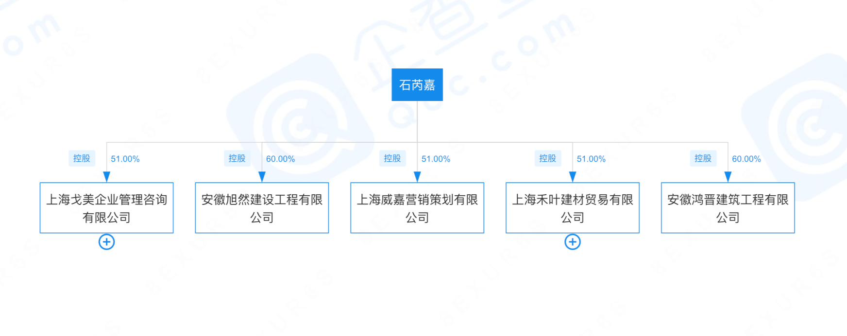 当前石芮嘉和郎建梅名下共有5子公司家,除了上海戈美,还包括了安徽鸿晋建筑工程、安徽旭然建设工程、上海禾叶建材贸易及上海威嘉营销策划。